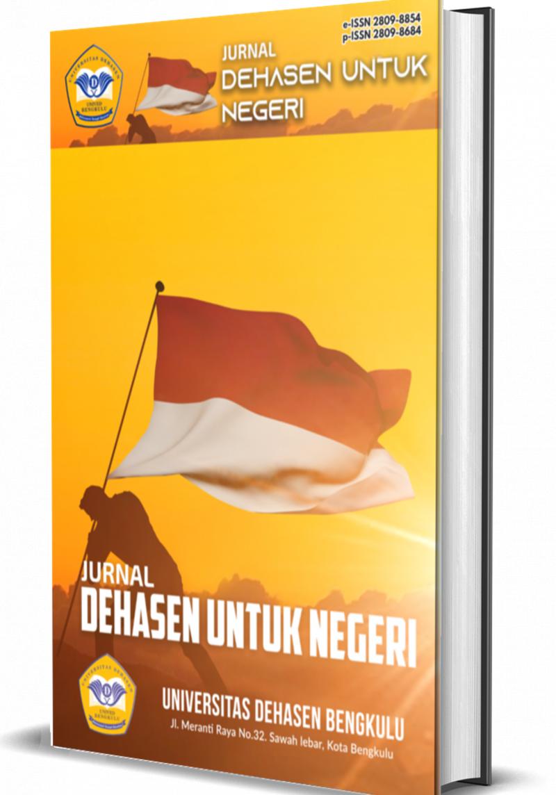 Jurnal Dehasen Untuk Negeri (Jurnal Pengabdian kepada Masyarakat) adalah jurnal multidisiplin ilmiah yang diterbitkan oleh Universitas Dehasen Bengkulu dengan menggunakan dua bahasa (Inggris dan Bahasa Indonesia). Jurnal Dehasen Untuk Negeri merupakan jurnal yang bertaraf nasional yang memiliki fokus utama pada pengembangan ilmu-ilmu di bidang pengabdian kepada masyarakat terbit dua kali dalam satu tahun yaitu pada bulan Januari dan Juli.